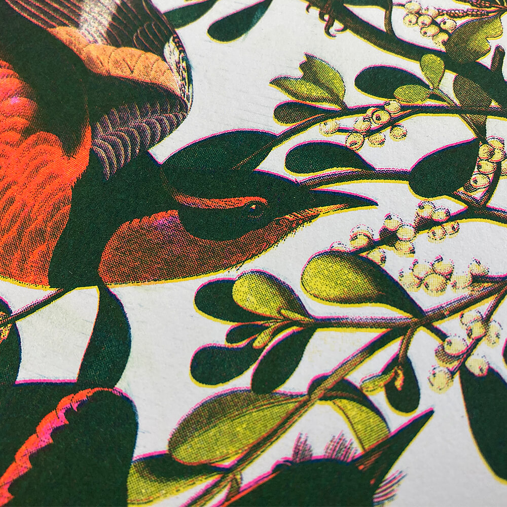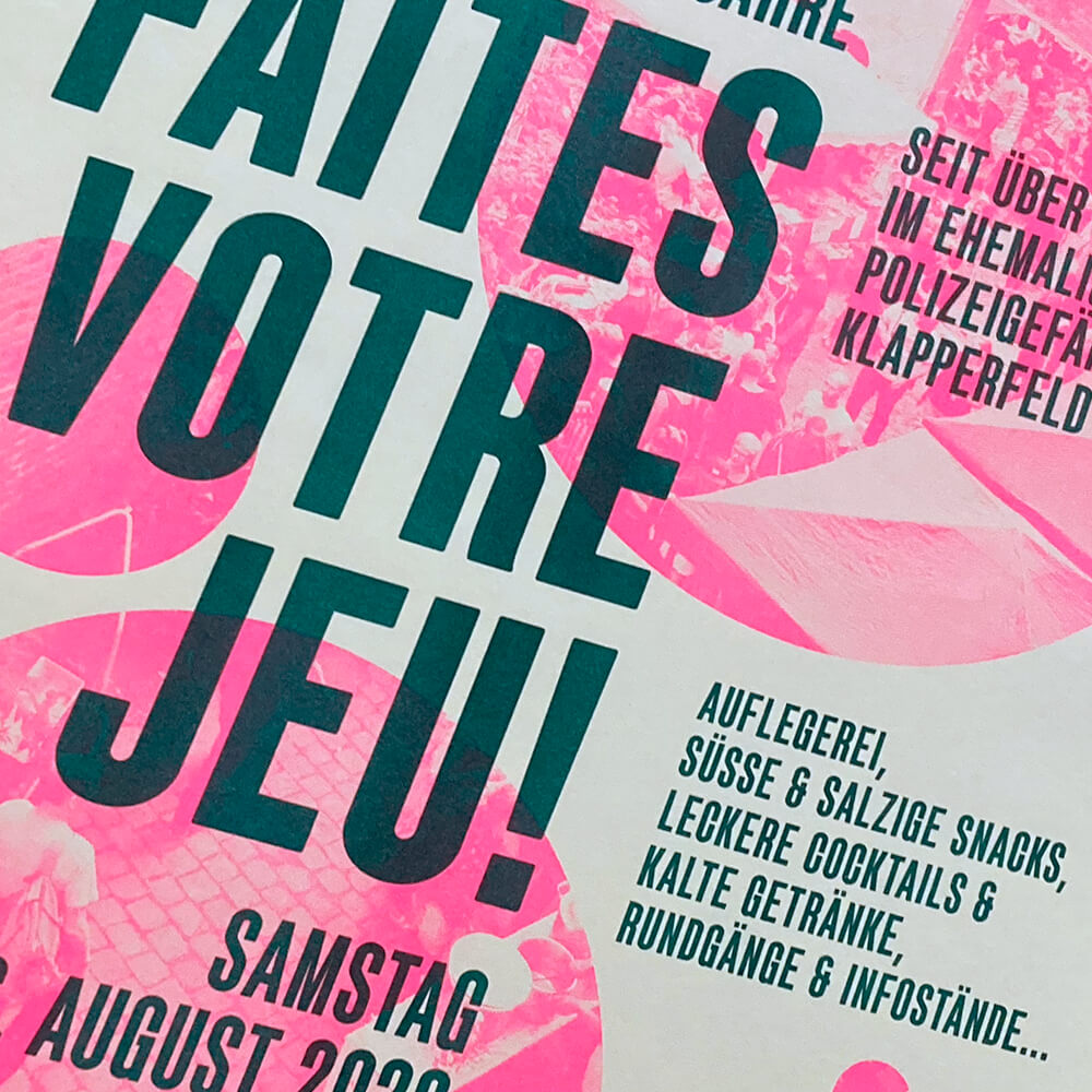 Risograph prints look damn good and the printing process is also one of the most environmentally friendly. The bright colours are based on soybean oil, no toxic chemicals are used. The master copies are made from quickly regrowing hemp fibres. In comparison to laser printing and other types of digital printing, only a fraction of the energy is required since the colours are applied to the paper without heat. In addition, especially in larger print runs, it is very affordable.